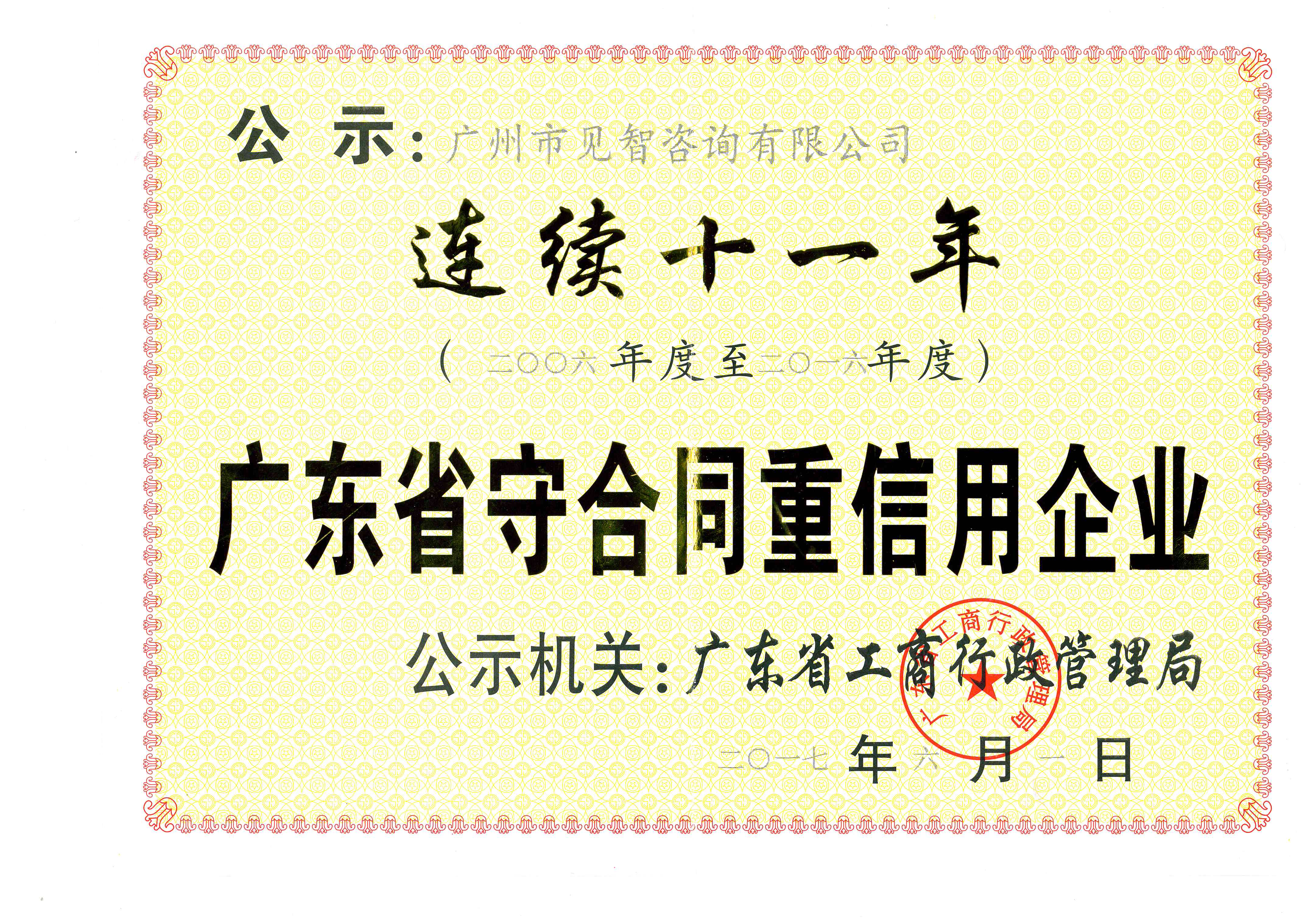 ?熱烈祝賀廣州市見智咨詢有限公司(以下簡稱“公司”)獲得由廣東省工商行政管理局頒發(fā)的“連續(xù)十一年重合同守信用”榮譽(yù),這一榮譽(yù)是社會、政府、市場客戶等多方對公司長期誠信經(jīng)營的充分肯定。