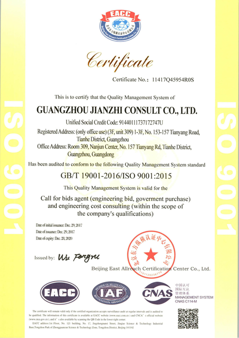 近日,廣州市見智咨詢有限公司順利通過質(zhì)量管理體系認(rèn)證審查,針對我司所從事的招標(biāo)代理(工程招標(biāo)、政府采購)及工程造價咨詢進行了審核,在公司全體員工的共同努力下,我司以完善的管理體系和嚴(yán)謹(jǐn)?shù)姆?wù)措施順利通過了GB/T 19001-2016  /ISO 9001:2015質(zhì)量管理體系認(rèn)證,并榮獲EACC(北京東方縱橫認(rèn)證中心有限公司)頒發(fā)的證書。